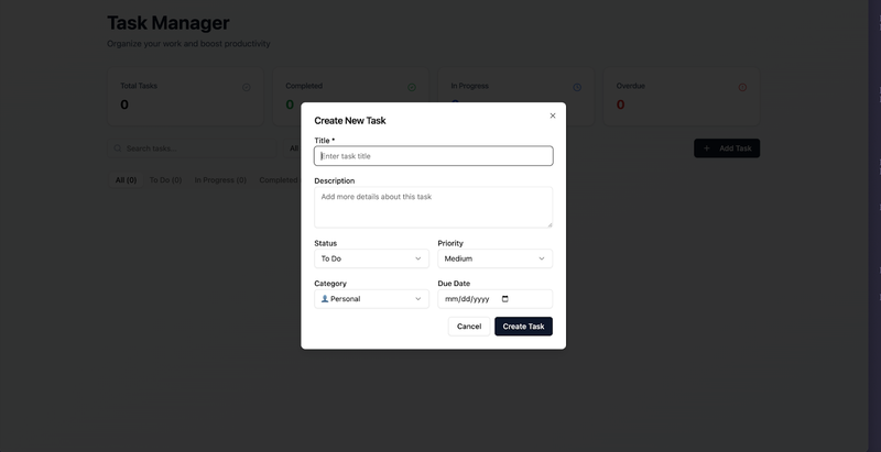 С skill Claude сгенерировал приложение с большей функциональностью «из коробки». Например, Claude включил компонент формы «Создать новую задачу», который позволяет пользователям указывать связанную категорию и срок выполнения для задач:
