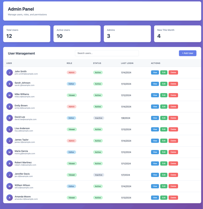 AI-сгенерированная админ-панель со стандартными UI-компонентами и минимальной визуальной иерархией. Skills не использовались.