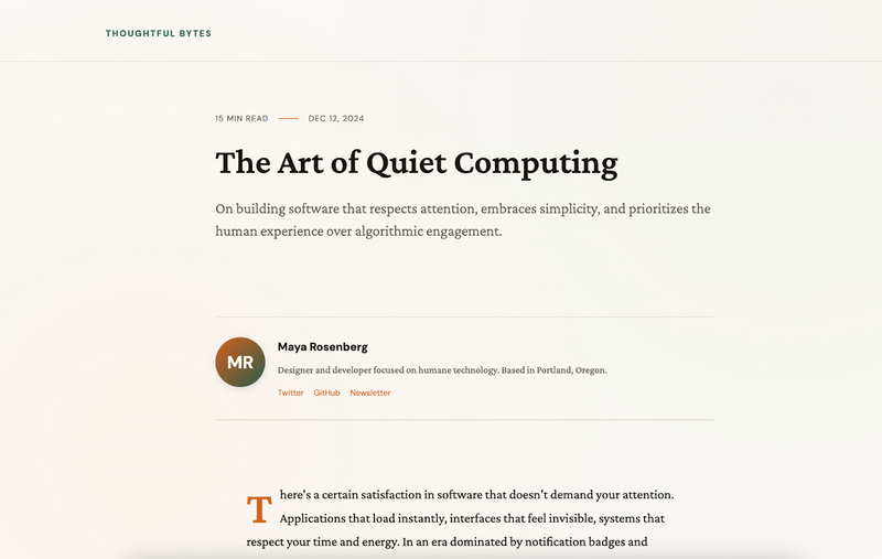 AI-сгенерированный макет блога с тем же промптом и frontend skill: редакционный шрифт с атмосферной глубиной и продуманными отступами.